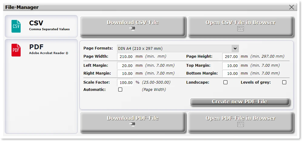 All reports can be created as PDF (= Printable Document Format) or CSV (= Comma Separated Values) by default.